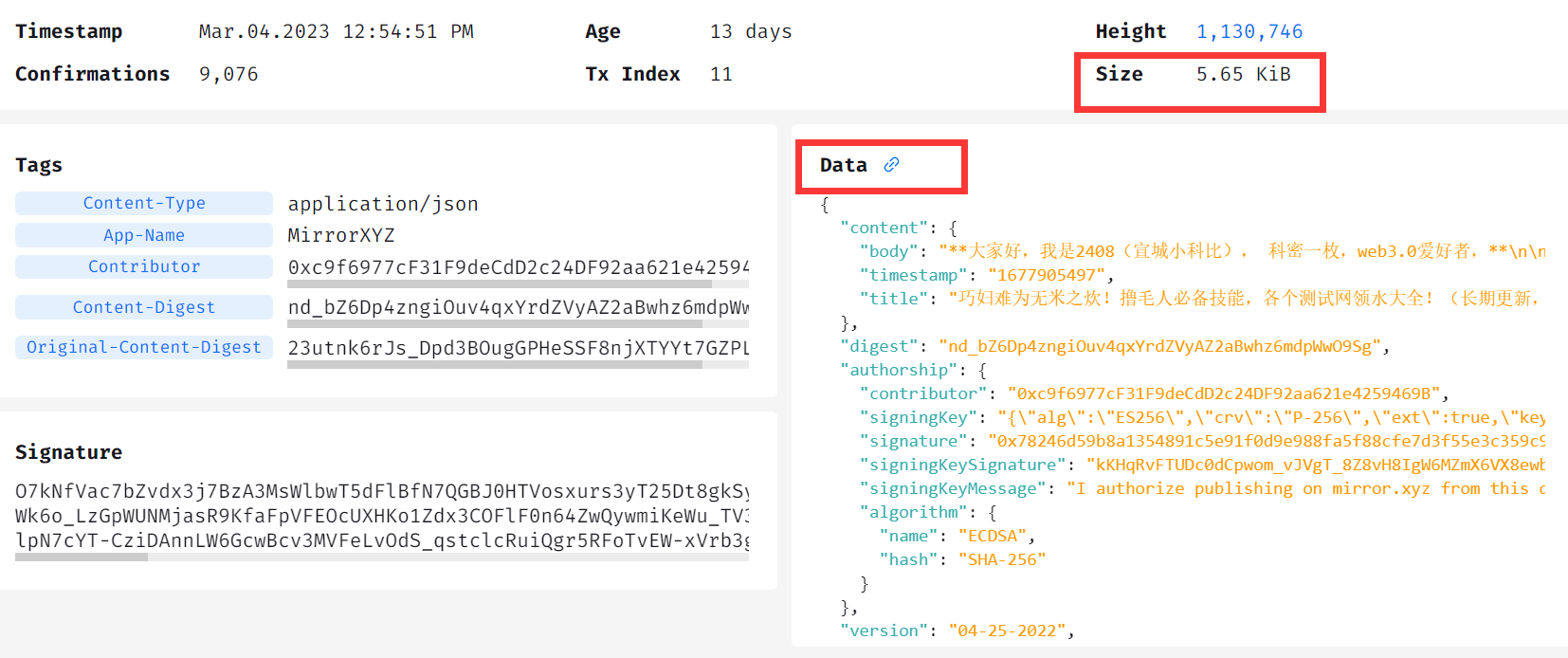 我们可以看到这篇文章上链的时间,AR手续费,以及数据大小,5.16KB。