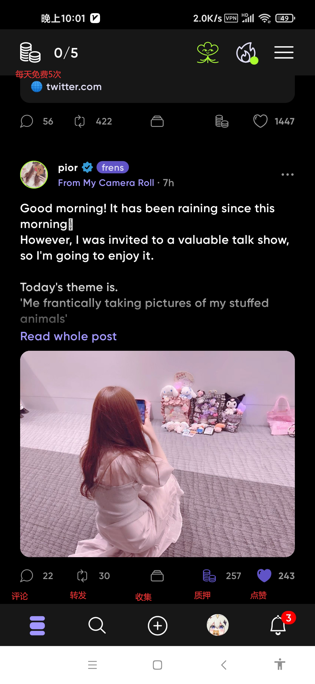 基本社交行为:评论、转发、收集、质押、点赞。(每天有5次质押机会)